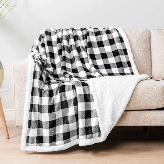 Black White Buffalo Plaid Sherpa Bed Blanket Queen, Plush Checkered Fleece, Soft Fuzzy Flannel Large for Couch Sofa, Warm Heavy Thick Winter Gift, 90X90